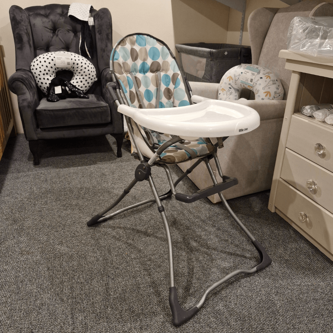 Rent a basic high chair for your next holiday or for your visitors. It is light and easy to fold up and store away. Fits easily onto the back seat of your car. It is super easy to clean the tray and the plastic-covered seat. The seat has a 3 point harness for safety.